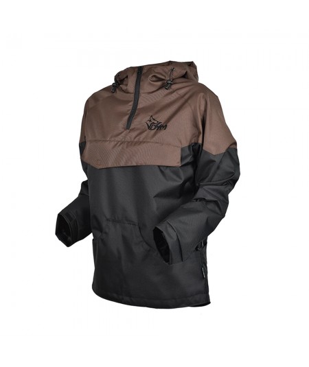 the black part of the jacket is partially waterproof, rubber coated under the 100% PES lining